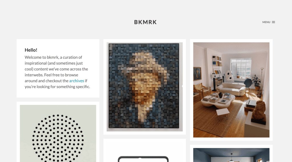 Bkmrk is a curated set of inspirational content that I come across on a daily basis. You can think of it as a semi-chaotic mood-board of images ranging from categories like Architecture and design all the way to typography and colors. Updated often, it serves as a place for me to look back for ideas or inspiration.